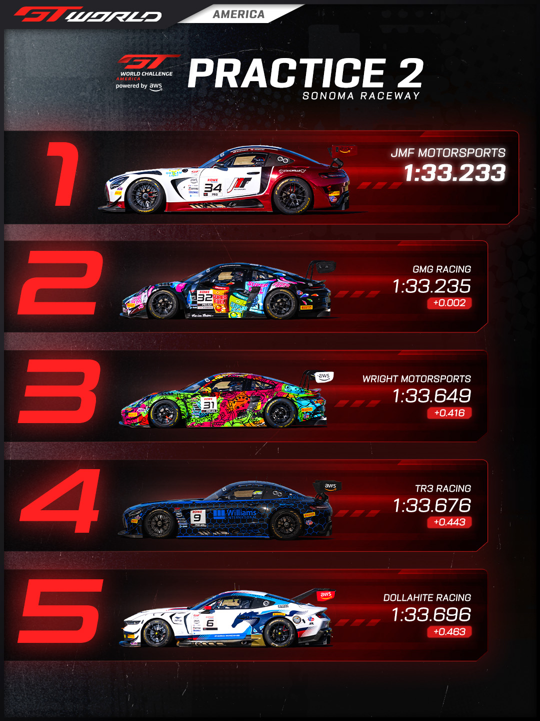 Practice 2 is complete for GT World Challenge America powered by AWS at Sonoma Raceway, and the pace at the front was razor-thin as the field continued to build toward the opening races of the 2026 season. JMF Motorsports topped the session overall with the No. 34 Mercedes-AMG GT3 EVO of Michai Stephens and Mikaël Grenier posting a best lap of 1:33.233, just 0.002 seconds clear of GMG Racing’s No. 32 Porsche 911 GT3 R of Kyle Washington and Tom Sargent. Wright Motorsports and TR3 Racing followed close behind in third and fourth, while Dollahite Racing rounded out the overall top five. AF Corse USA once again paced the Am class with the No. 163 Ferrari 296 GT3 EVO.