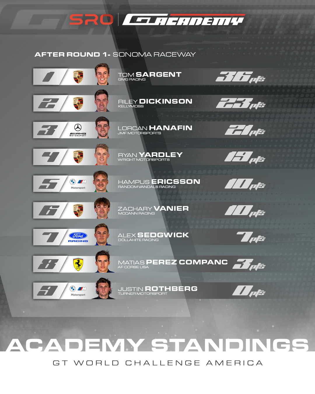 “To be part of the SRO GT Academy program is super exciting,” said Tom Sargent. “It’s a great program that SRO is offering this year to help Silver drivers take the next step in their careers. I was fortunate enough to compete in the CrowdStrike 24 Hours of Spa last year and the thought of possibly getting a chance to go back is awesome. It’s obviously the premier GT3 race in the world and it’s great to be able to compete against the best there is. We have a long season ahead with many rounds still to go before the final decision is made, but we’re off to a very good start this year and hopefully we can continue the strong momentum.”